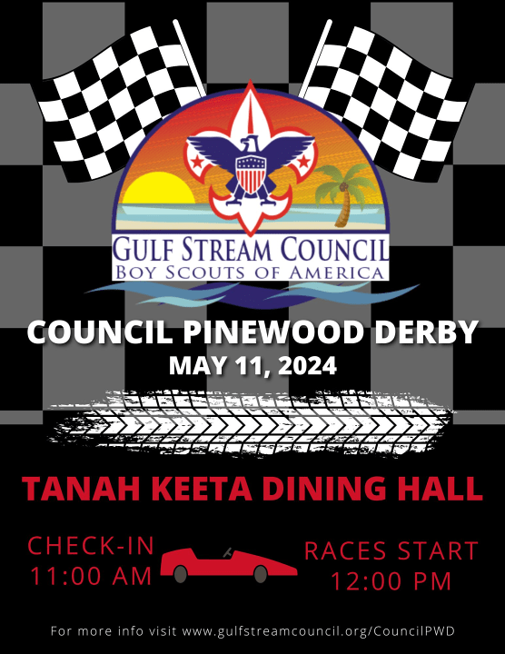 The top 3 racers from each Rank in each District will race to see who has the fastest car in the Gulf Stream Council!