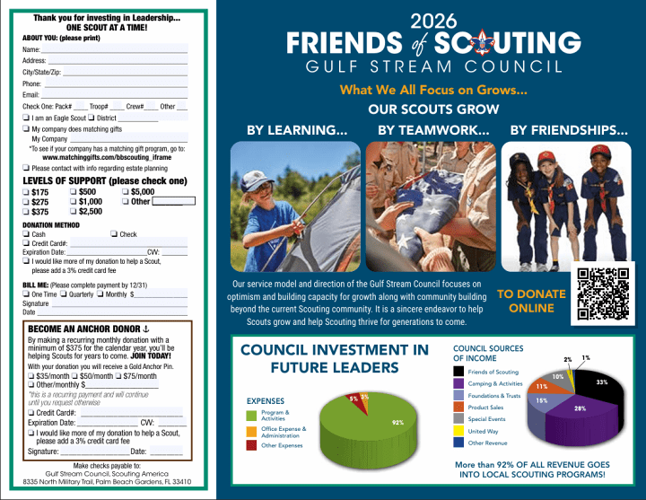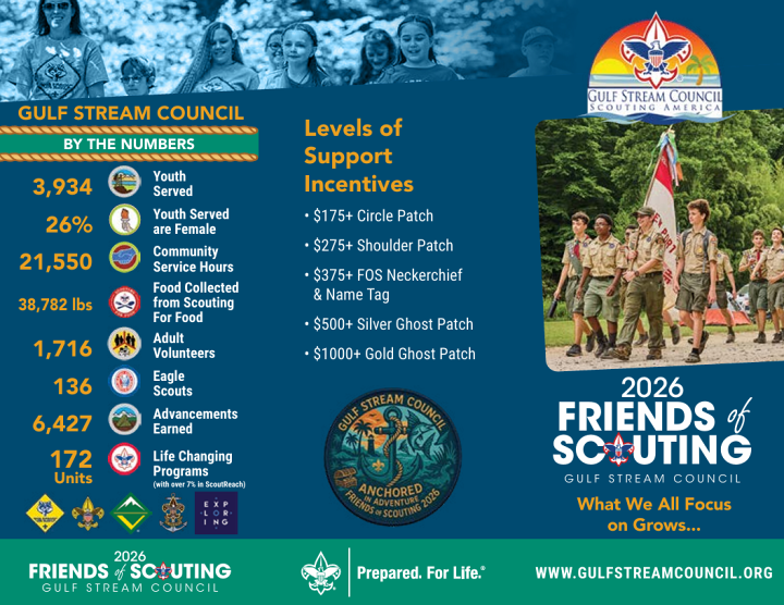 Thanks to the generosity of our "Friends of Scouting," the Gulf Stream Council continues to deliver its mission of bringing the Scouting experience to the seven counties of southeastern Florida: Indian River, St. Lucie, Martin, Palm Beach, Okeechobee, Glades, and Hendry.